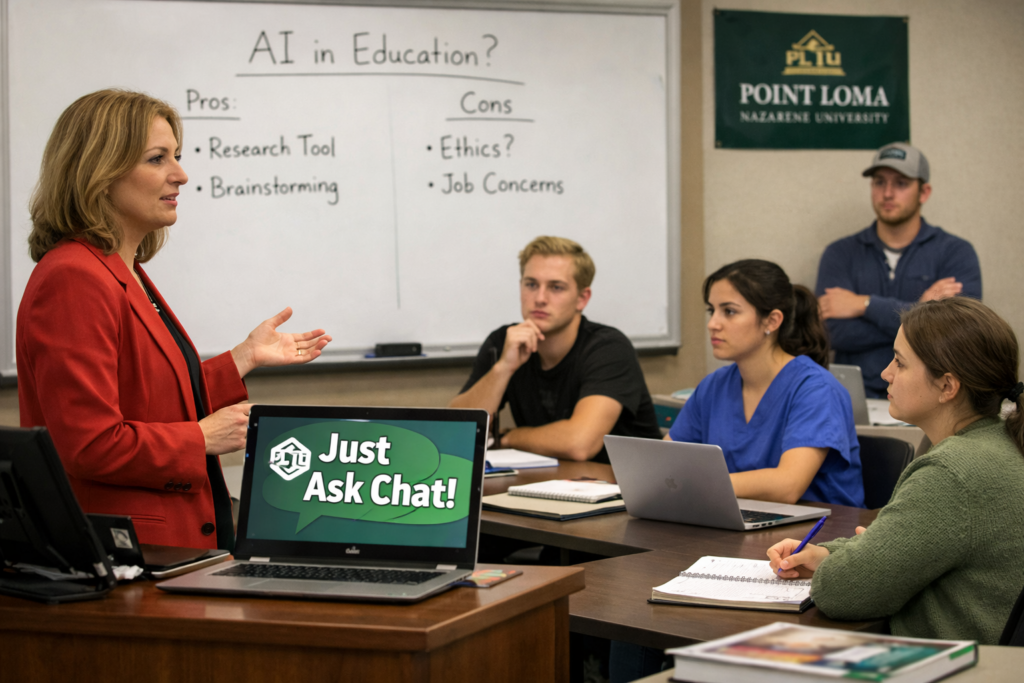 “Just ask Chat” is a phrase that has become a staple on the Point Loma Nazarene University campus. Since its release to the public in 2022, ChatGPT and other generative AI platforms have established a large presence in many university classrooms. Students and professors across disciplines at PLNU are still trying to understand if and how they should be using AI in the education process.