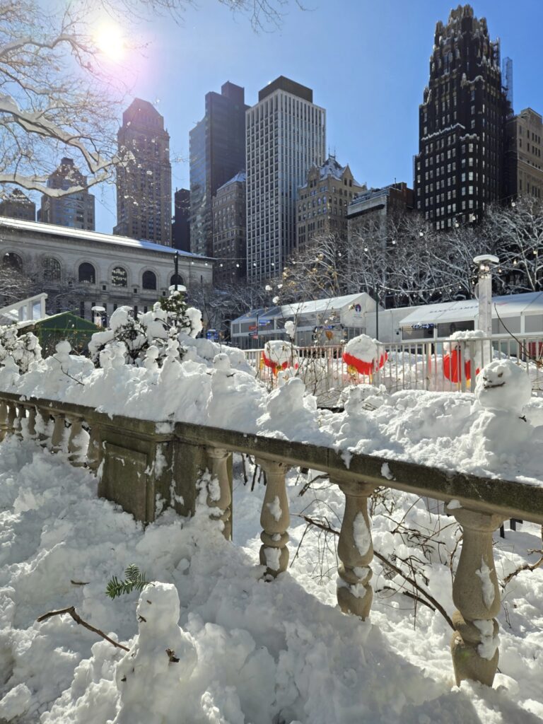Snowmen lined up in Bryant Park on Feb. 24 after the blizzard in New York City. Photo by Grace Chaves/The Point.